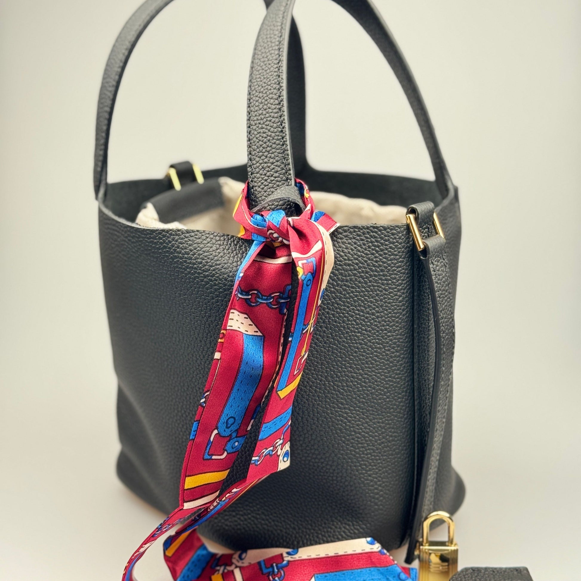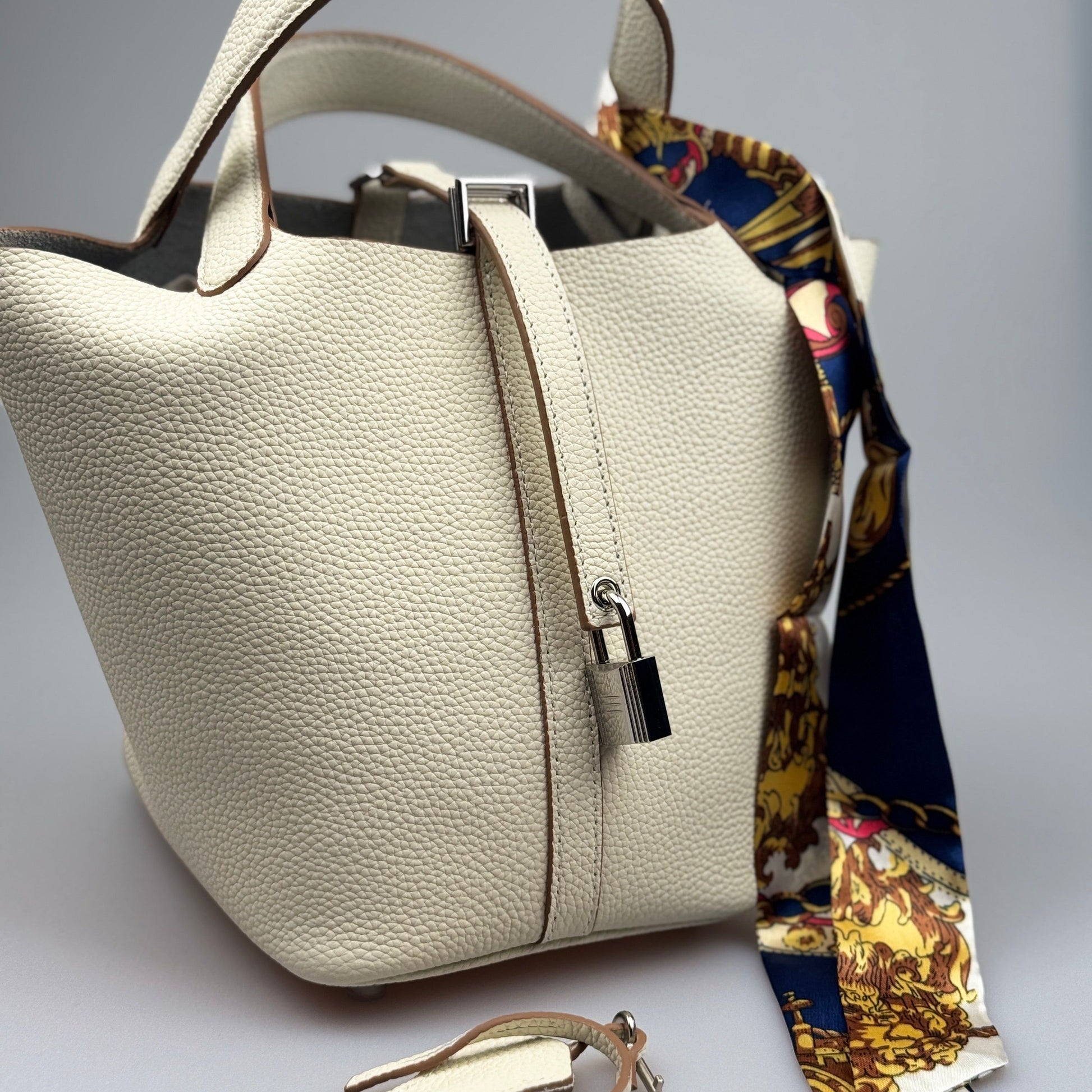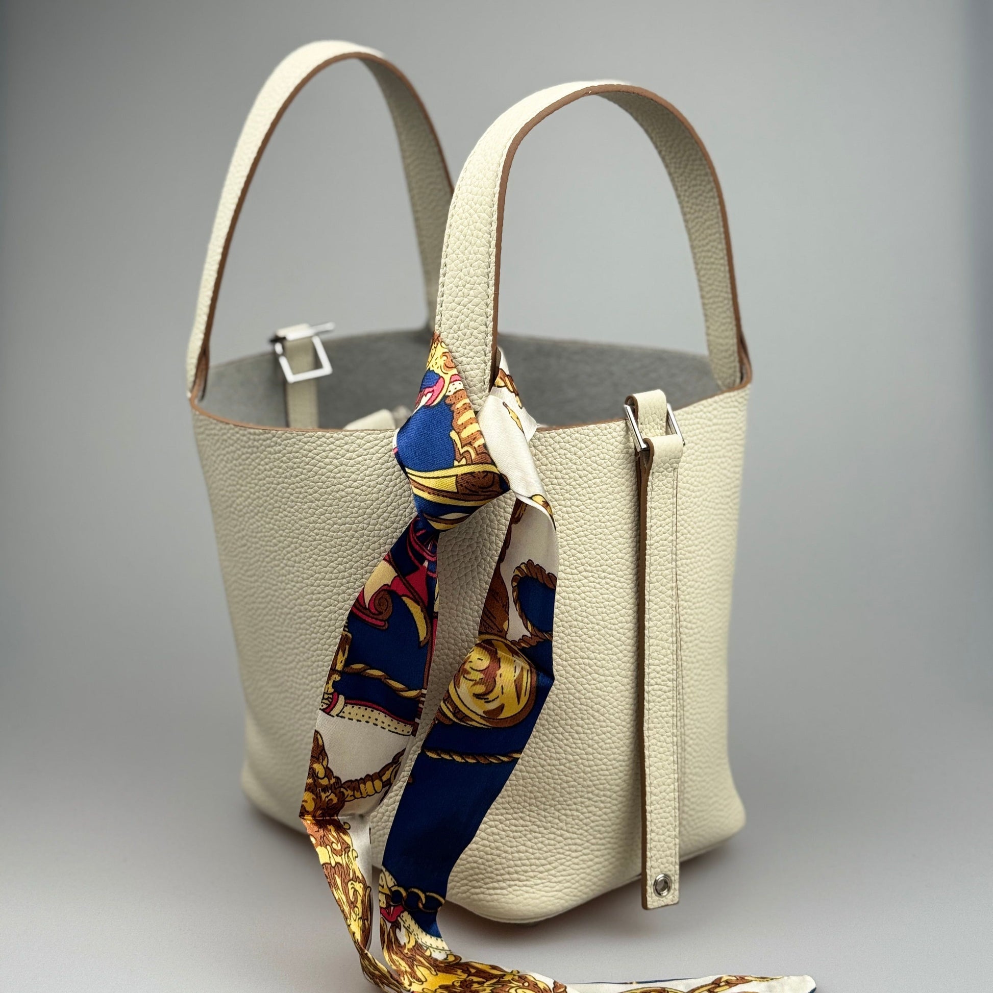 Esta mala bucket é inteiramente confeccionada em pele genuína de alta qualidade, com textura premium e acabamento duradouro. O design minimalista é realçado por um lenço decorativo em seda estampada, que pode ser usado de várias formas, acrescentando um toque sofisticado ao seu look.