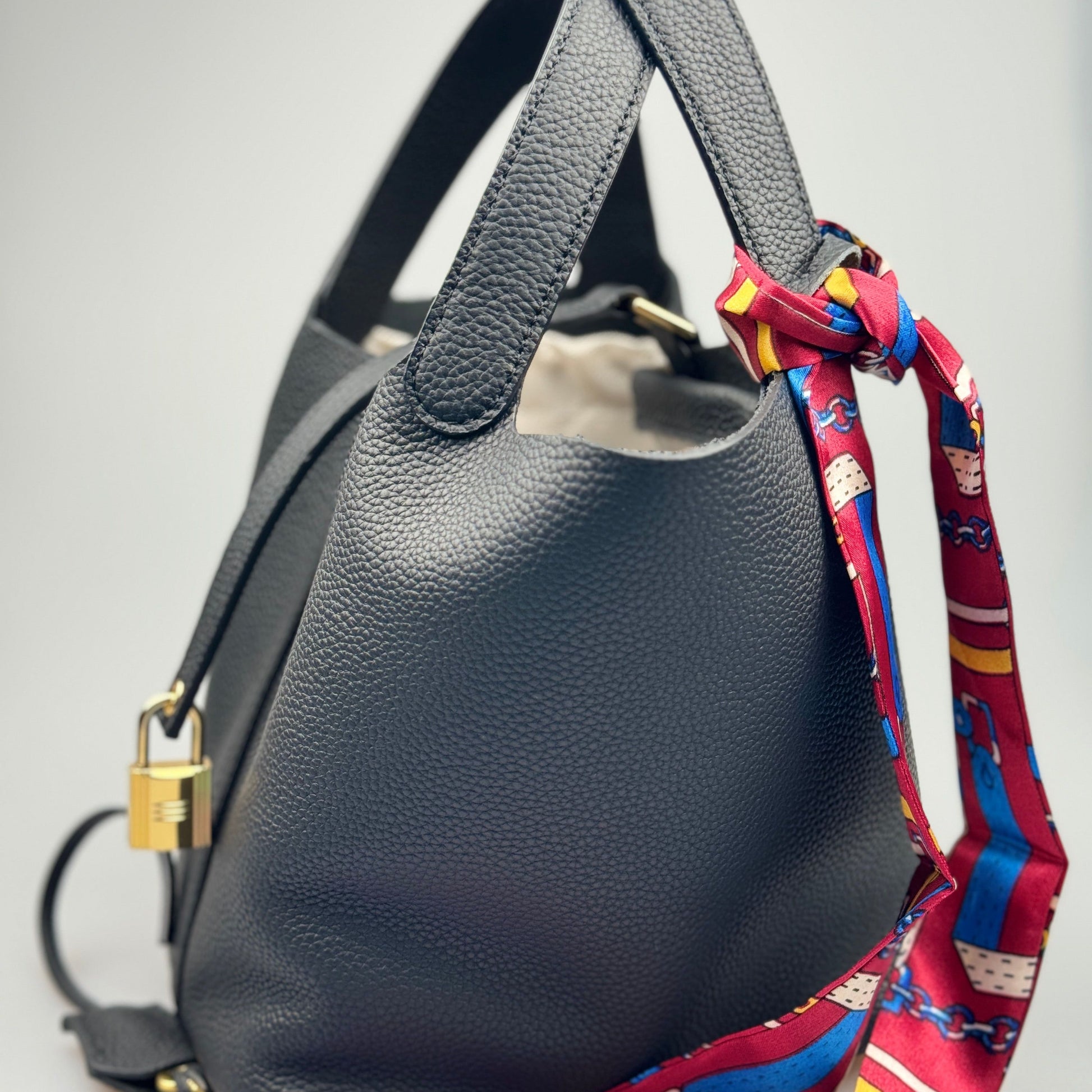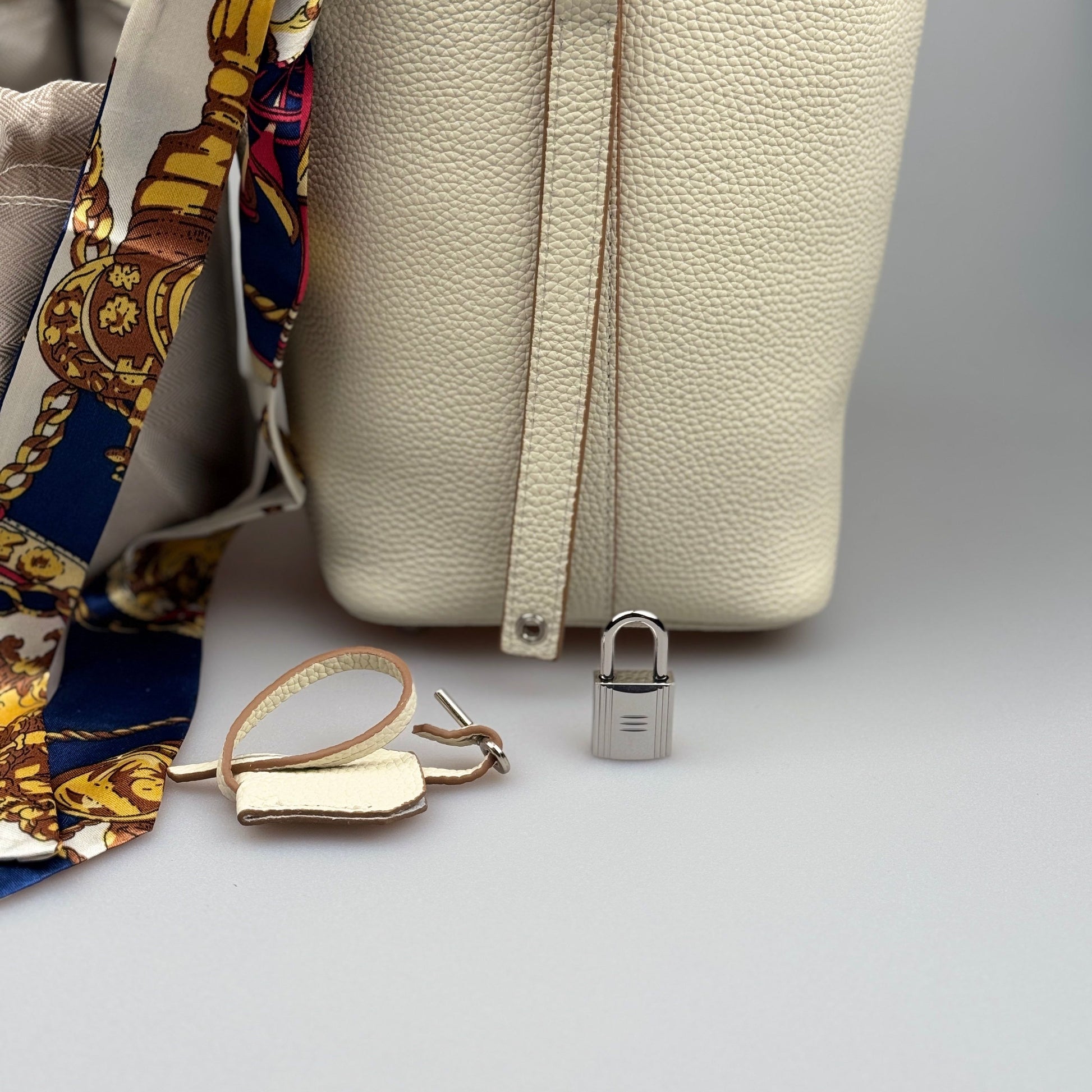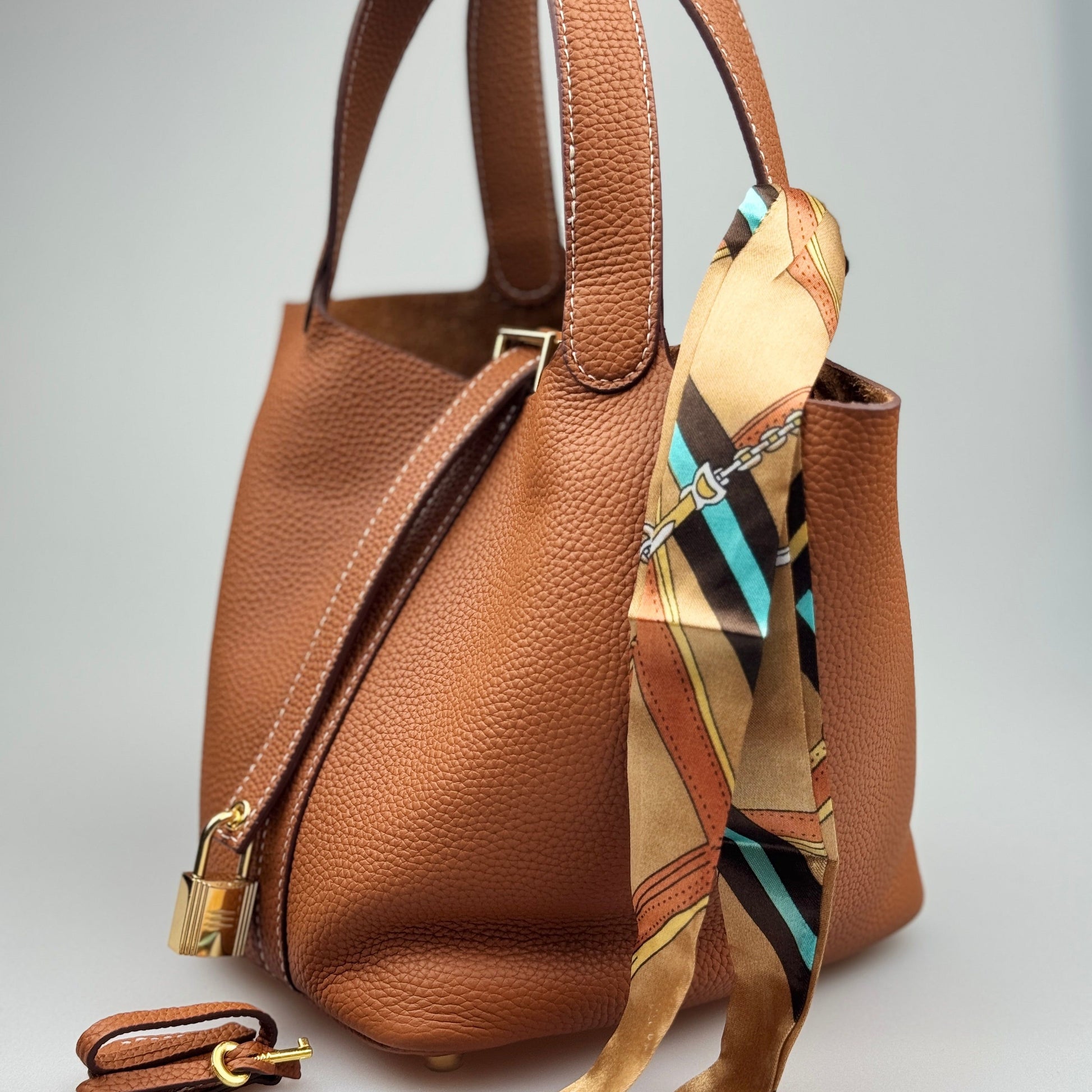 Esta mala bucket é inteiramente confeccionada em pele genuína de alta qualidade, com textura premium e acabamento duradouro. O design minimalista é realçado por um lenço decorativo em seda estampada, que pode ser usado de várias formas, acrescentando um toque sofisticado ao seu look.