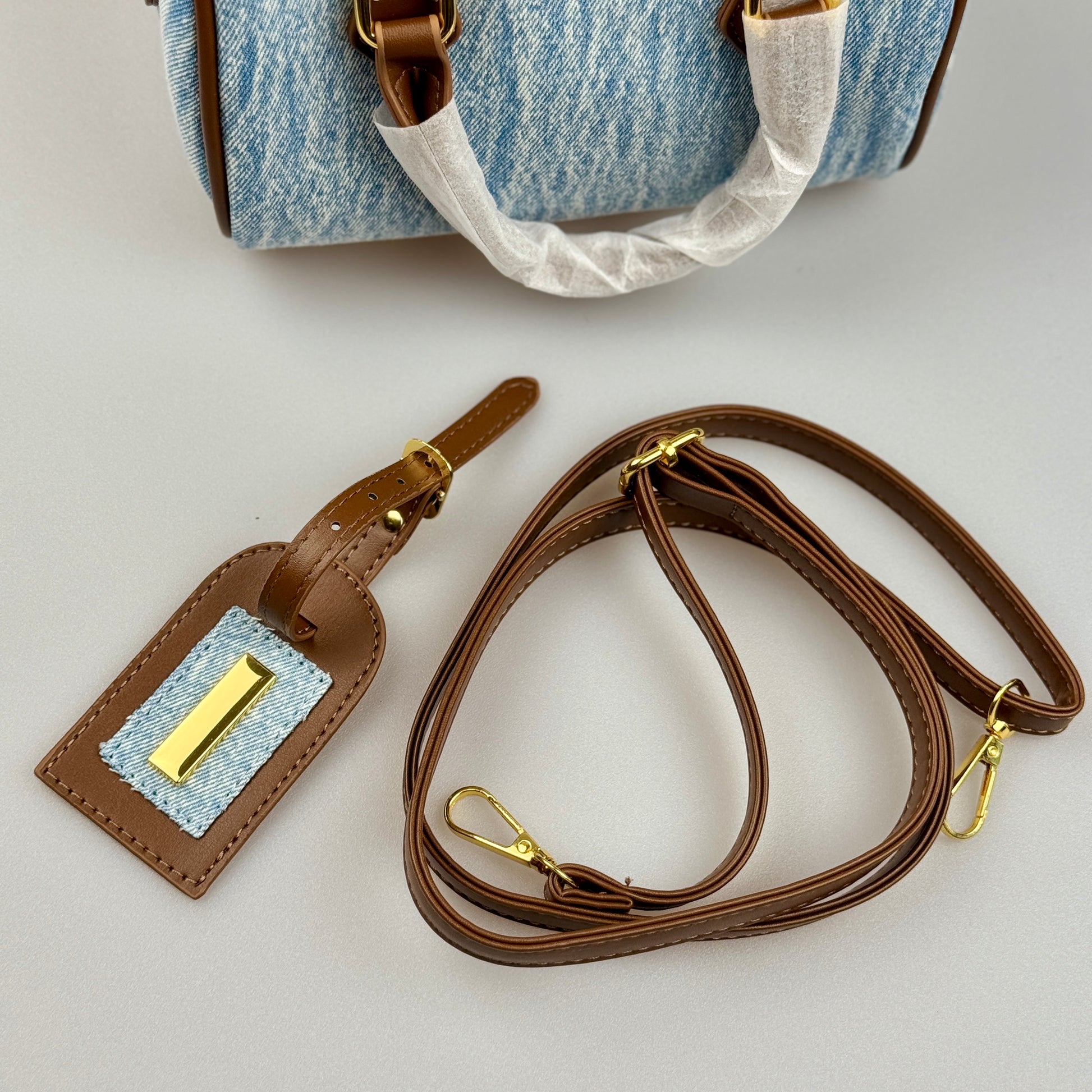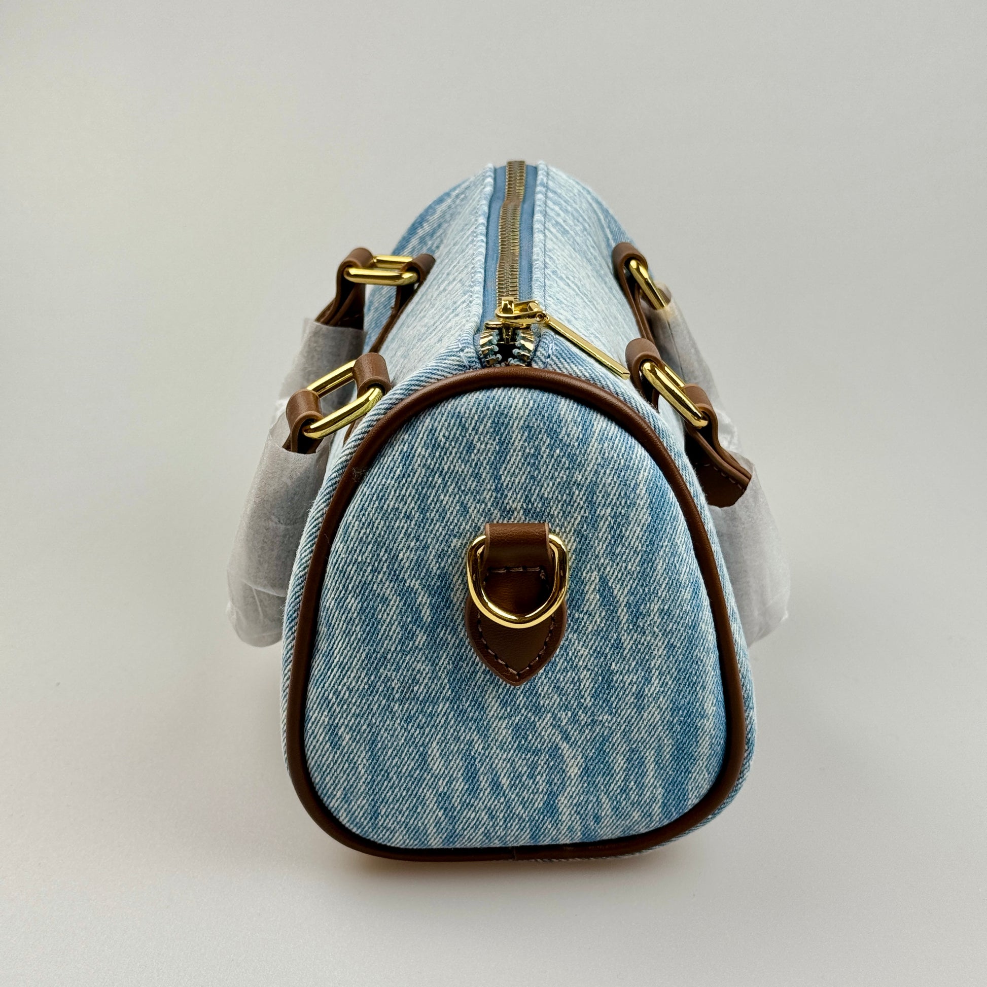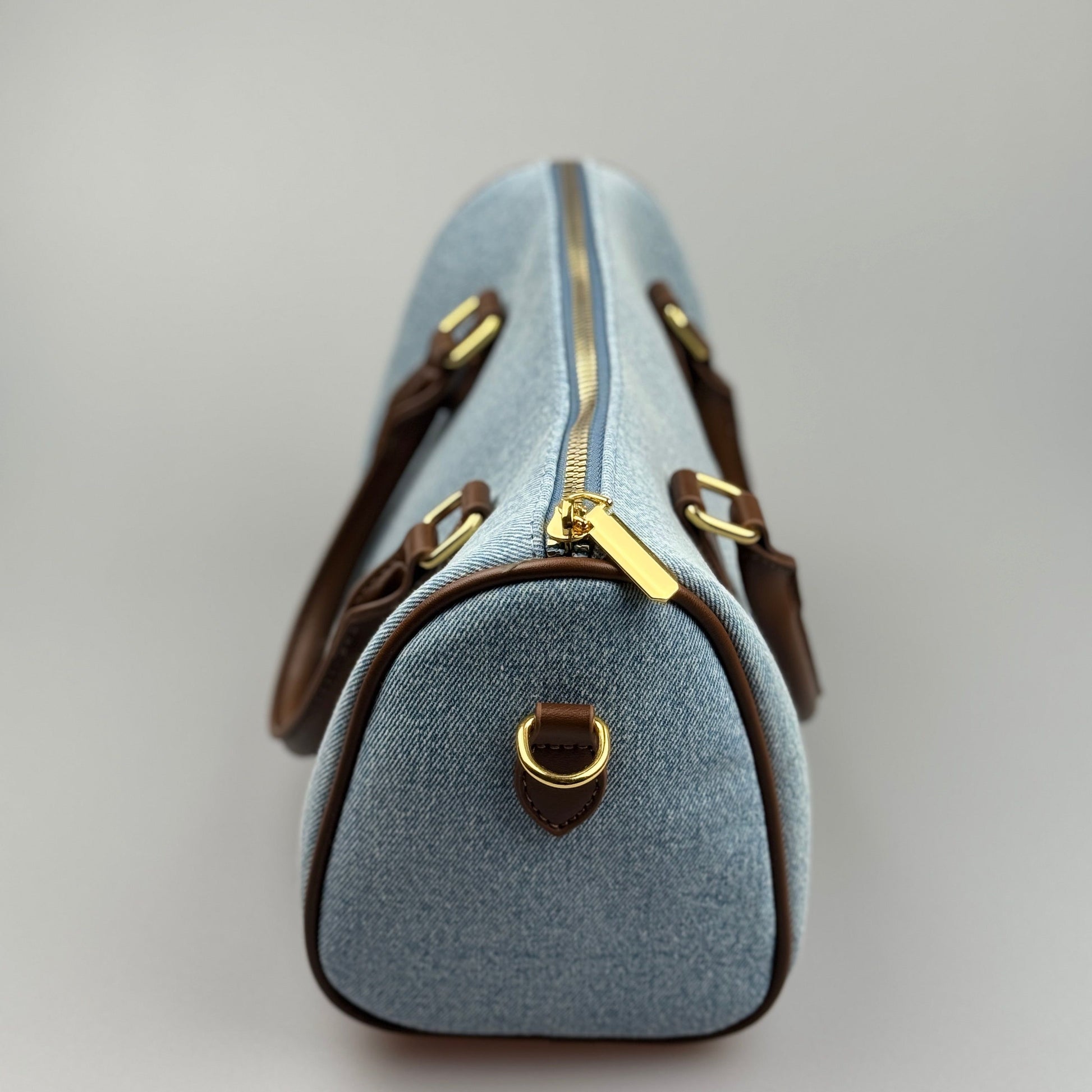 A Mala Denim Vintage com Detalhes em Couro é a combinação perfeita entre estilo retro e funcionalidade moderna. Com um formato barrel compacto e estrutura firme, esta peça destaca-se pelo tecido jeans azul-claro e acabamentos em couro sintético castanho, criando um look marcante, casual e elegante.