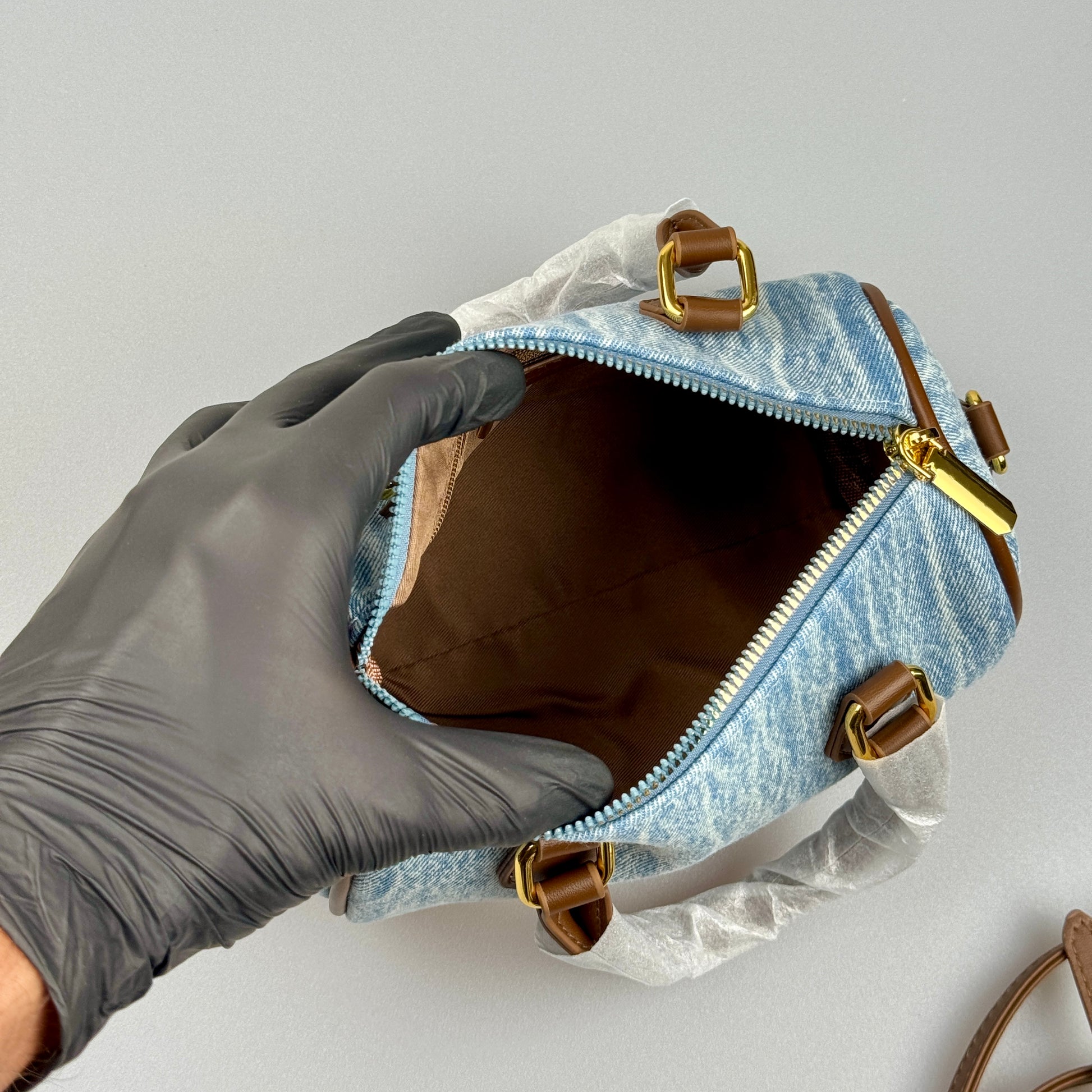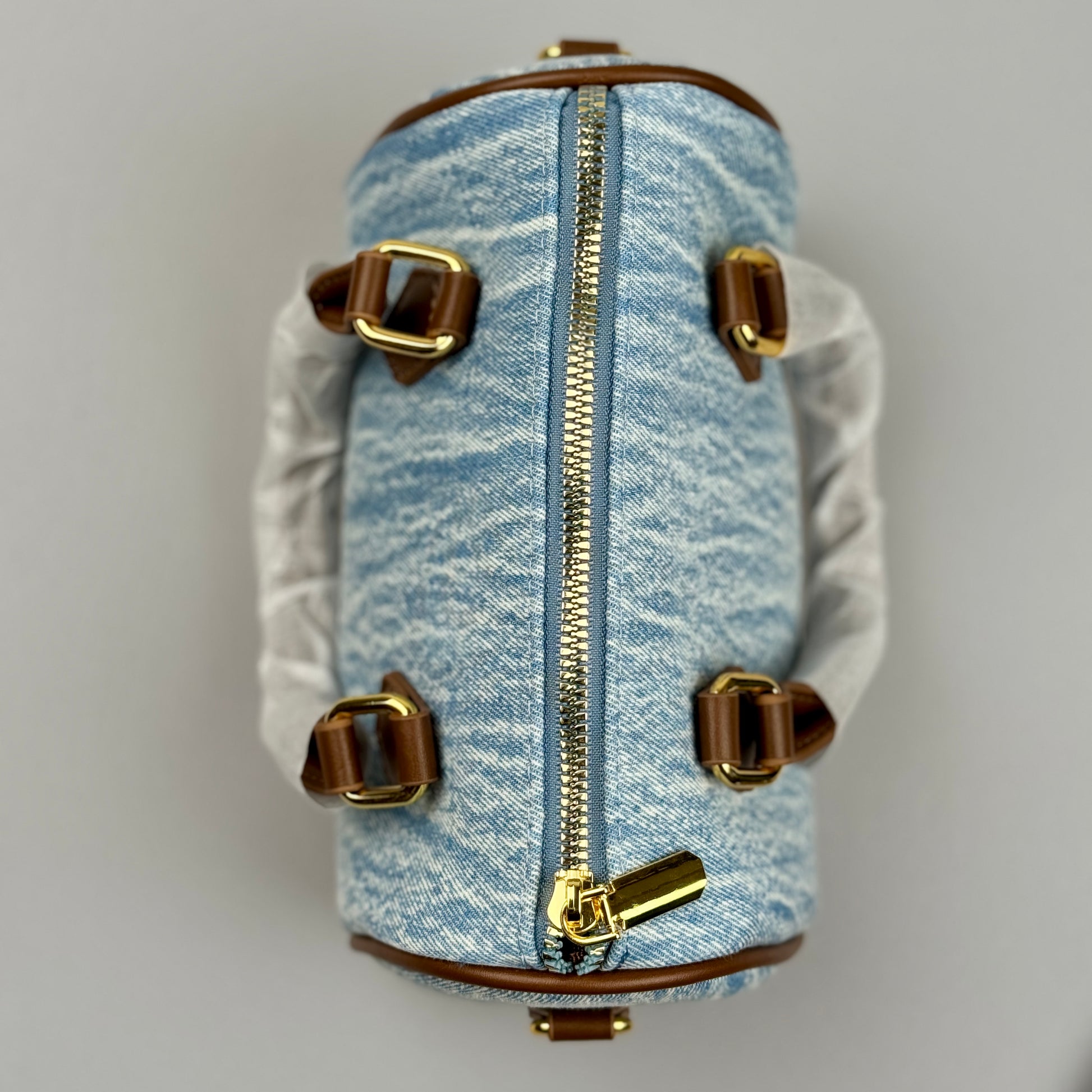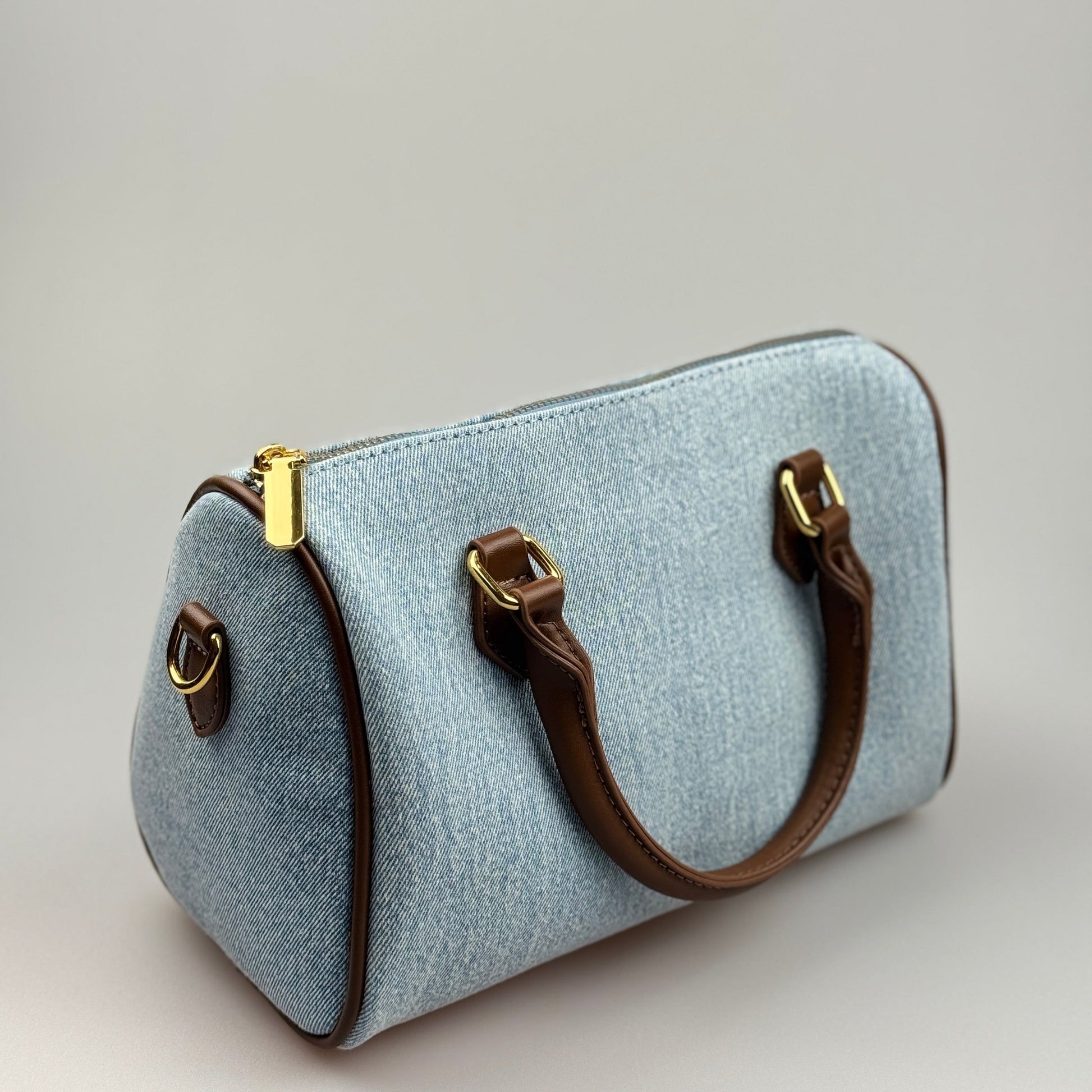 A Mala Denim Vintage com Detalhes em Couro é a combinação perfeita entre estilo retro e funcionalidade moderna. Com um formato barrel compacto e estrutura firme, esta peça destaca-se pelo tecido jeans azul-claro e acabamentos em couro sintético castanho, criando um look marcante, casual e elegante.