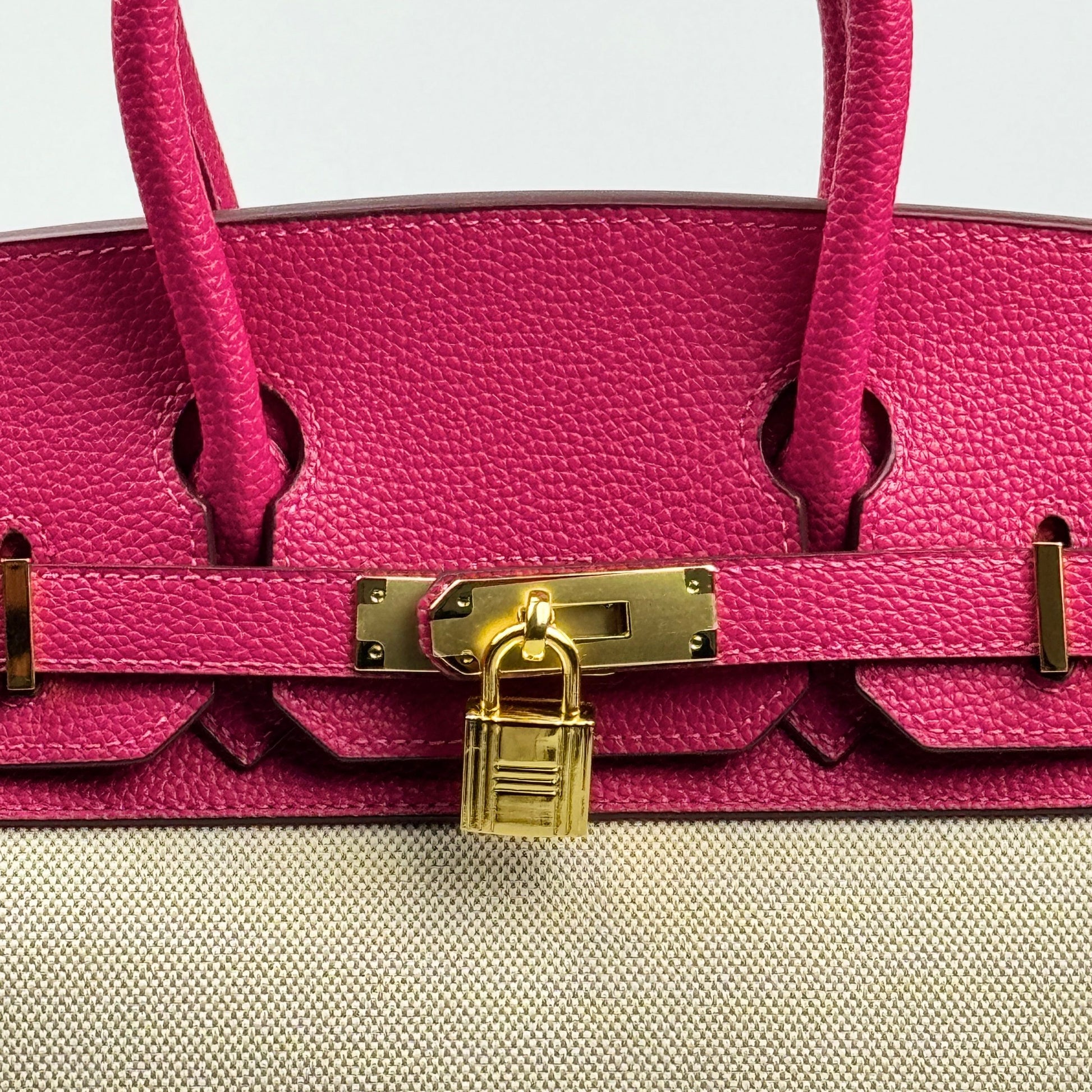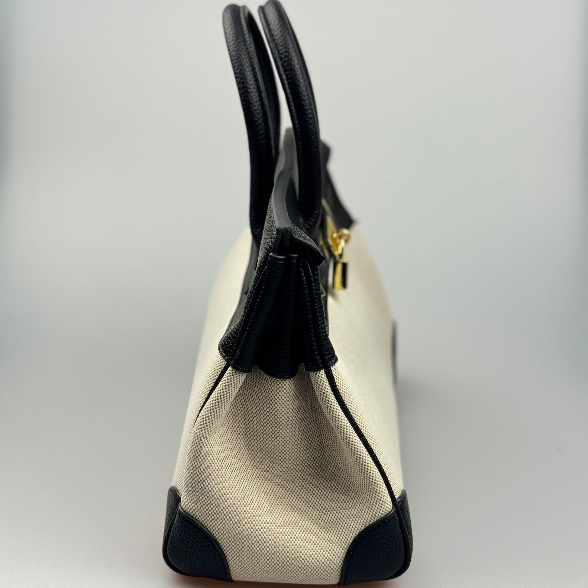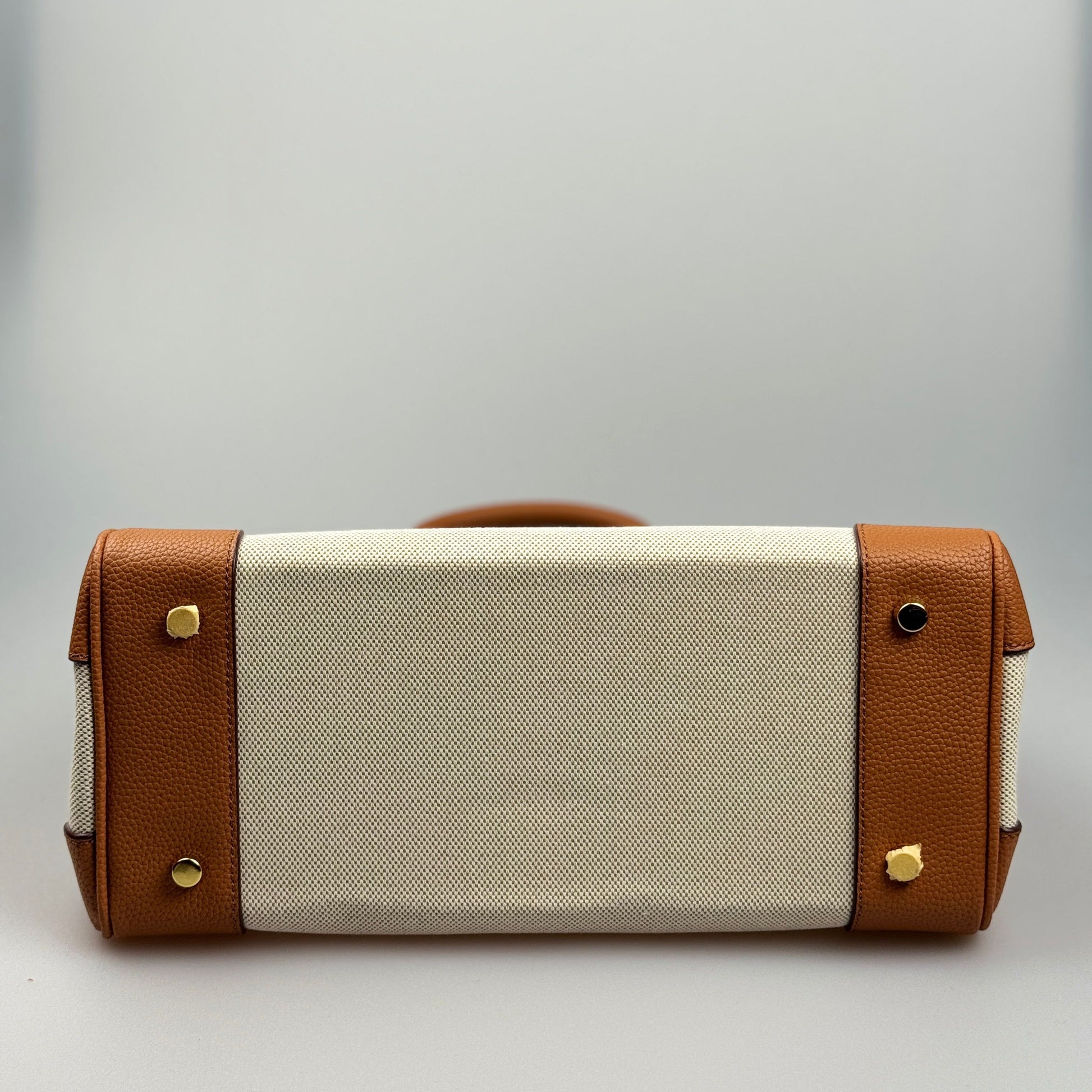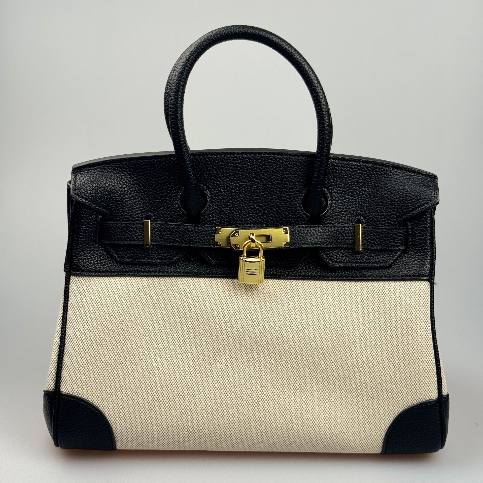 Sofisticação no seu auge. A Mala Estilo Birkin em Tela e Pele Genuína representa o expoente máximo da elegância na nossa coleção. Fabricada com uma combinação de tela robusta de alta gramagem e pele genuína de qualidade superior, esta peça alia durabilidade, requinte e intemporalidade.