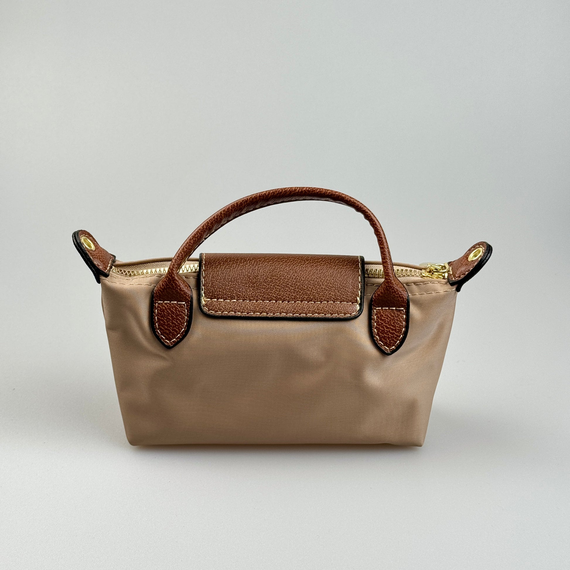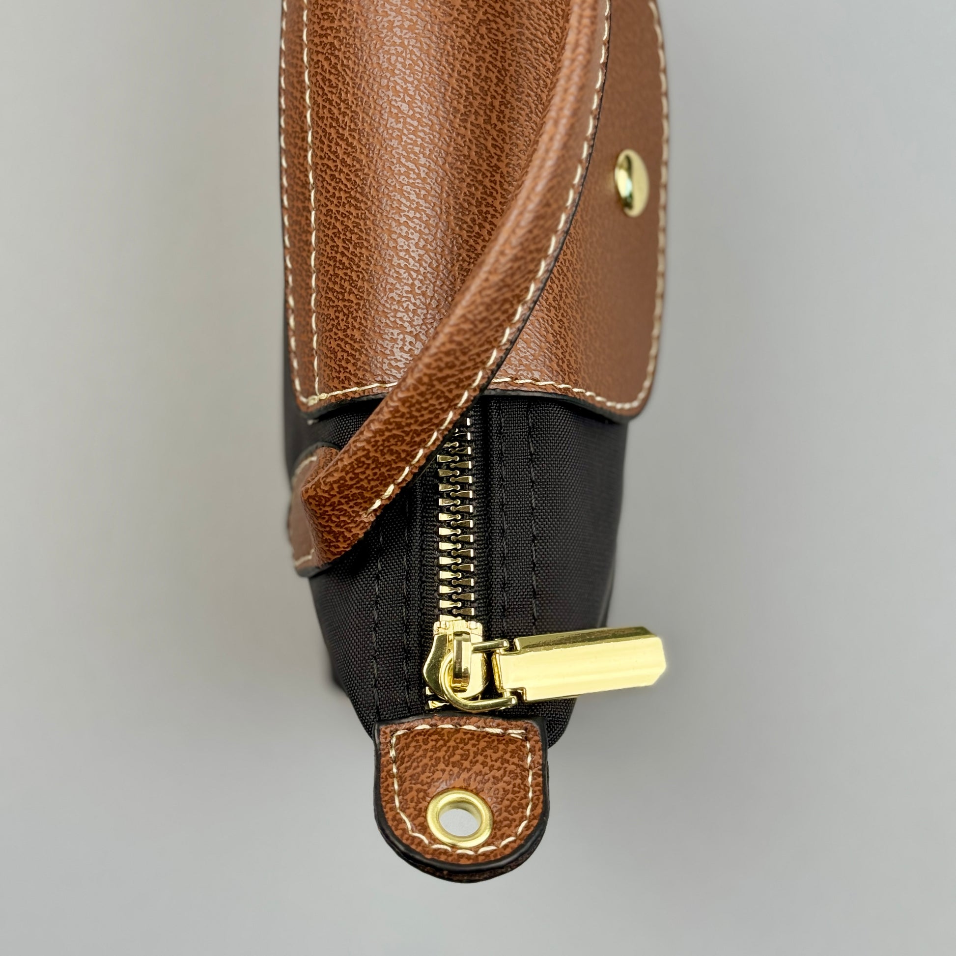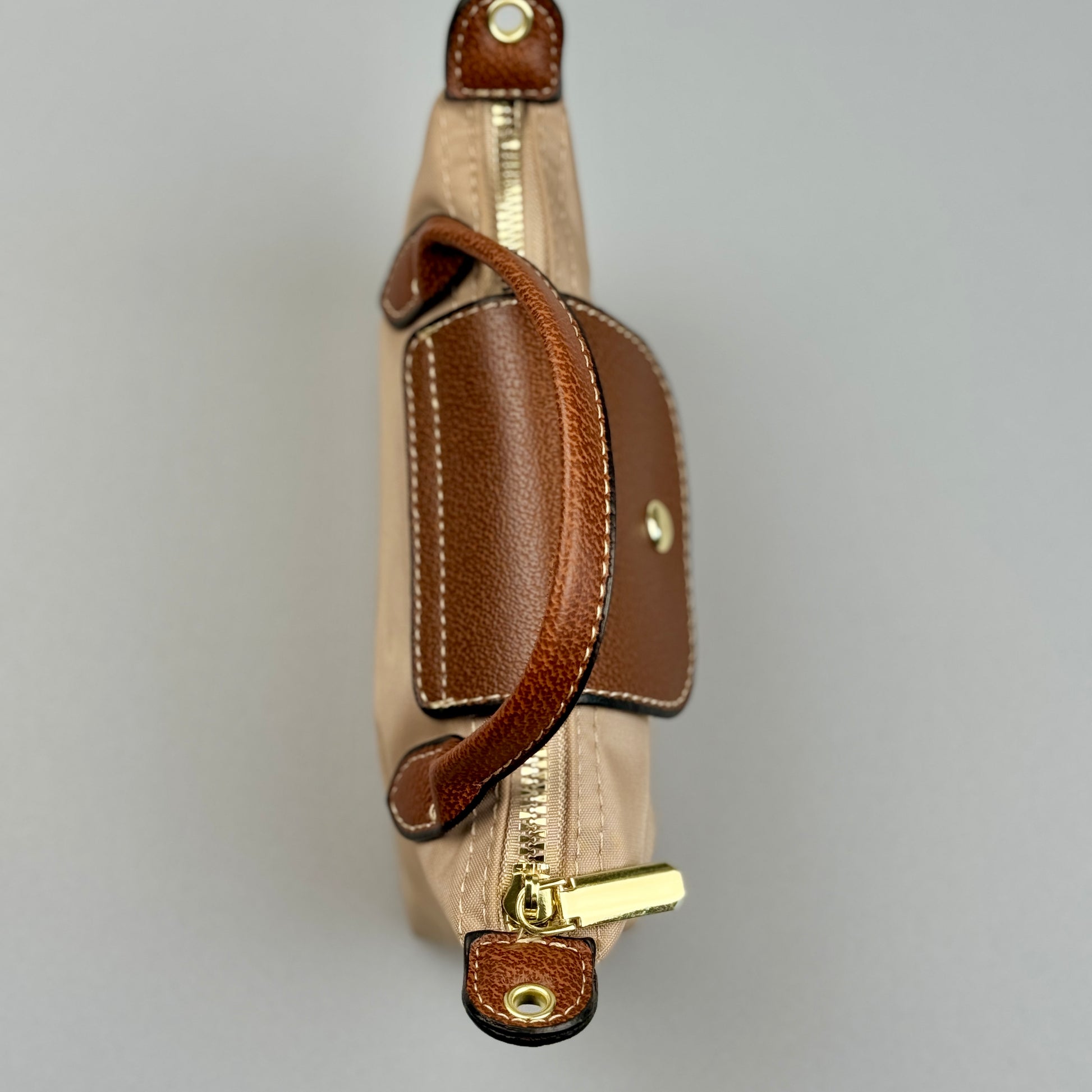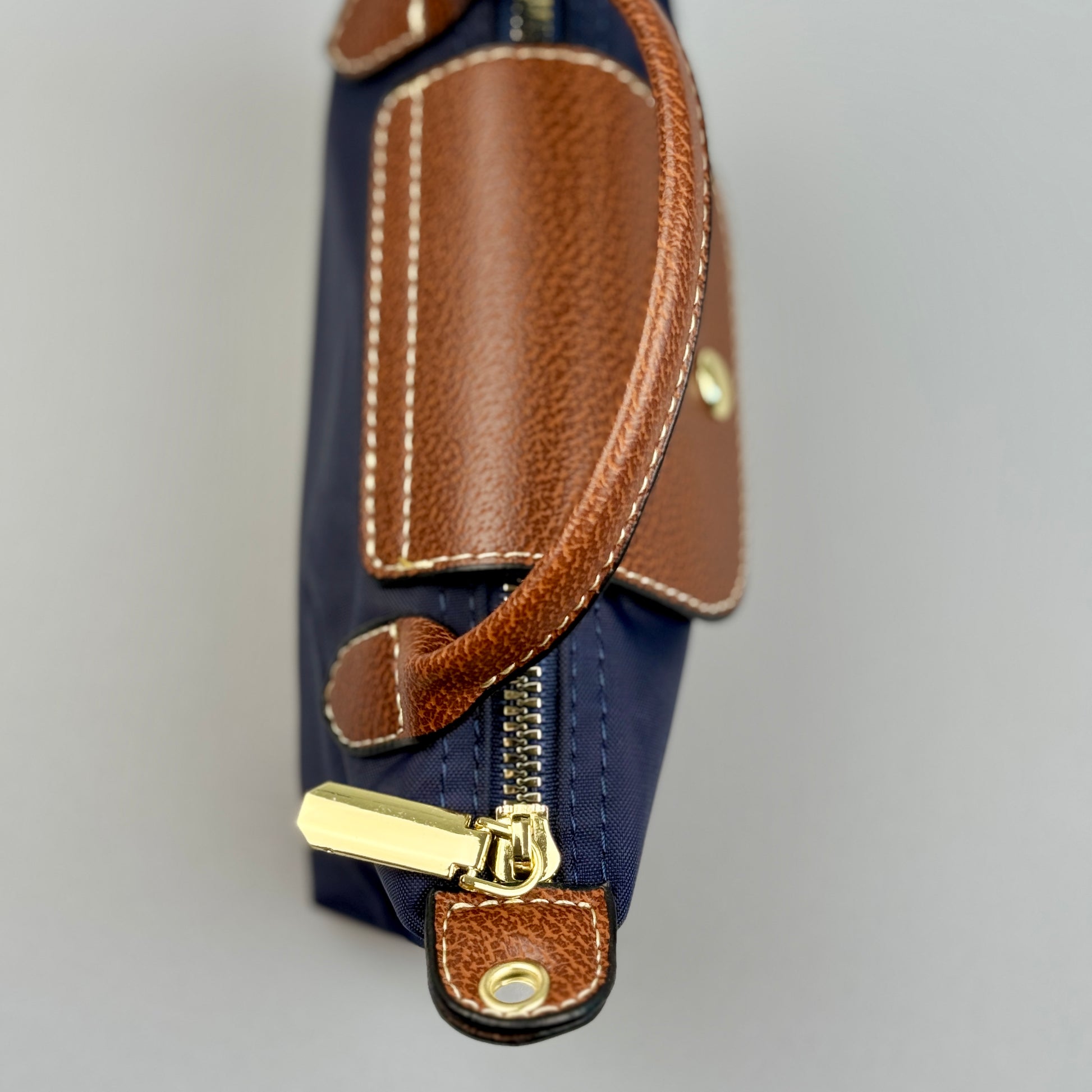 Fabricada em nylon resistente com detalhes em pele sintética e ferragens douradas, oferece um visual moderno sem comprometer a funcionalidade. Apesar do tamanho compacto, tem espaço suficiente para o essencial: telemóvel, carteira, chaves e batom.
